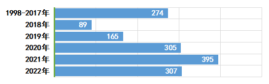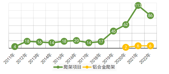 截止到2022年底,共有427項(xiàng)爬架項(xiàng)目通過了住建部科技與產(chǎn)業(yè)化發(fā)展中心評估,其中2022年86項(xiàng),包含6項(xiàng)鋼-鋁合金組合爬架,同比下降23%。