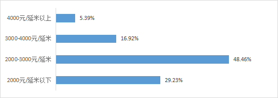 企業(yè)租賃價格(半年起租,不含勞務(wù))在小于2000元/延米占29.23%,2000-3000元/延米區(qū)間占48.46%,3000-4000元/延米區(qū)間占16.92%,大于4000元/延米占5.39%。(租賃價格的大幅下降,主要是受疫情停工影響)