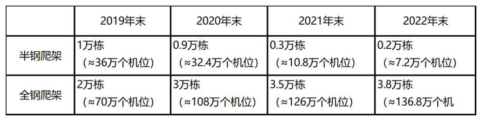 截止到2022年末,爬架市場機(jī)位存量整體保持在4萬棟左右(144萬個機(jī)位),各地政策及標(biāo)準(zhǔn)的推動下,全鋼架快速替代半鋼架,達(dá)到136.8萬個機(jī)位,半鋼架存量持續(xù)減少,市場上僅7.2萬個機(jī)位左右,全鋼架與半鋼架存量比為19:1。2022年全鋼架增速同比下降50%左右。受鋁錠價格大幅上漲影響,鋁合金爬架機(jī)位增幅很小,總存量仍不足1萬個機(jī)位。