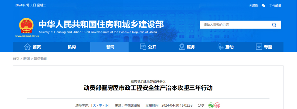 2024年4月,住建部召開房屋市政工程安全行動(dòng)部署會(huì)議。會(huì)議強(qiáng)調(diào),各地要突出重點(diǎn)精準(zhǔn)施策,準(zhǔn)確把握治本攻堅(jiān)三年行動(dòng)的目標(biāo)任務(wù)。一是健全施工安全事前預(yù)防機(jī)制。建立隱患排查和責(zé)任倒查機(jī)制,推動(dòng)重大事故隱患動(dòng)態(tài)清零,提升危大工程安全管控水平。二是構(gòu)建施工安全數(shù)字化監(jiān)管體系.......等。